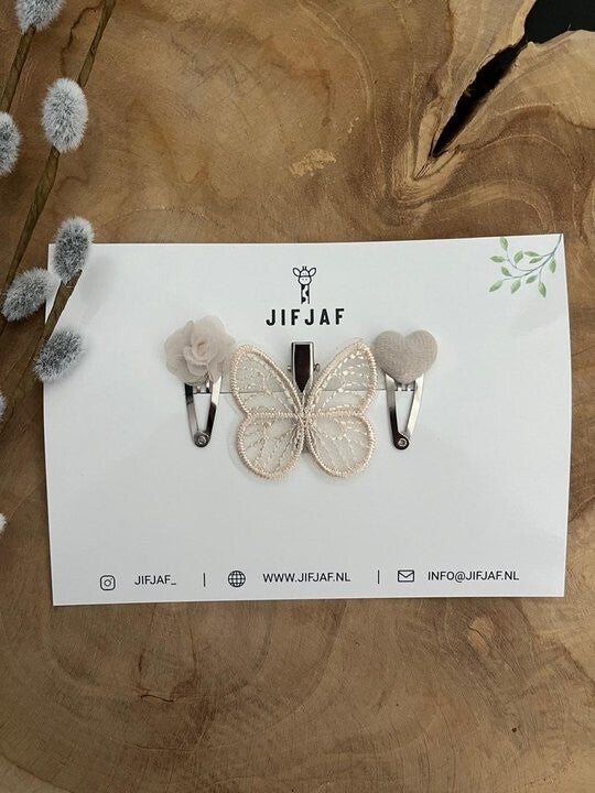- Klik klak haarspeldjes van 3 cm groot en één alligatorclip van 3 cm groot, in de kleur zilver.