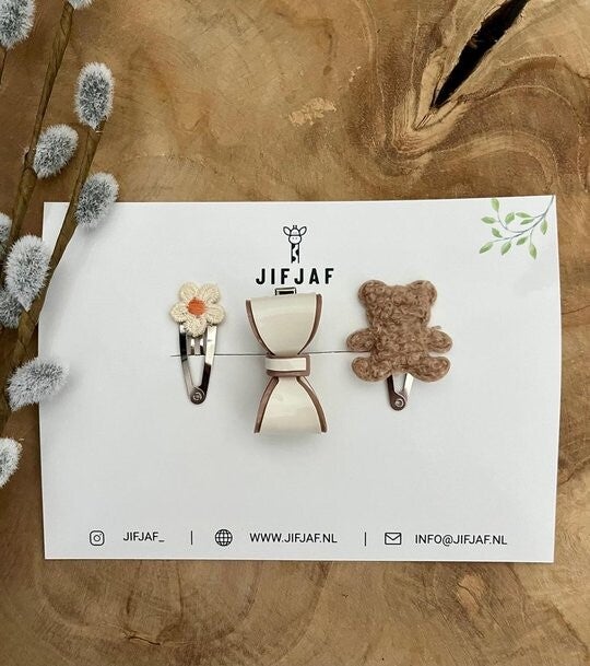 - Klik klak haarspeldjes van 3 cm groot en één alligatorclip van 3 cm groot in de kleur zilver.